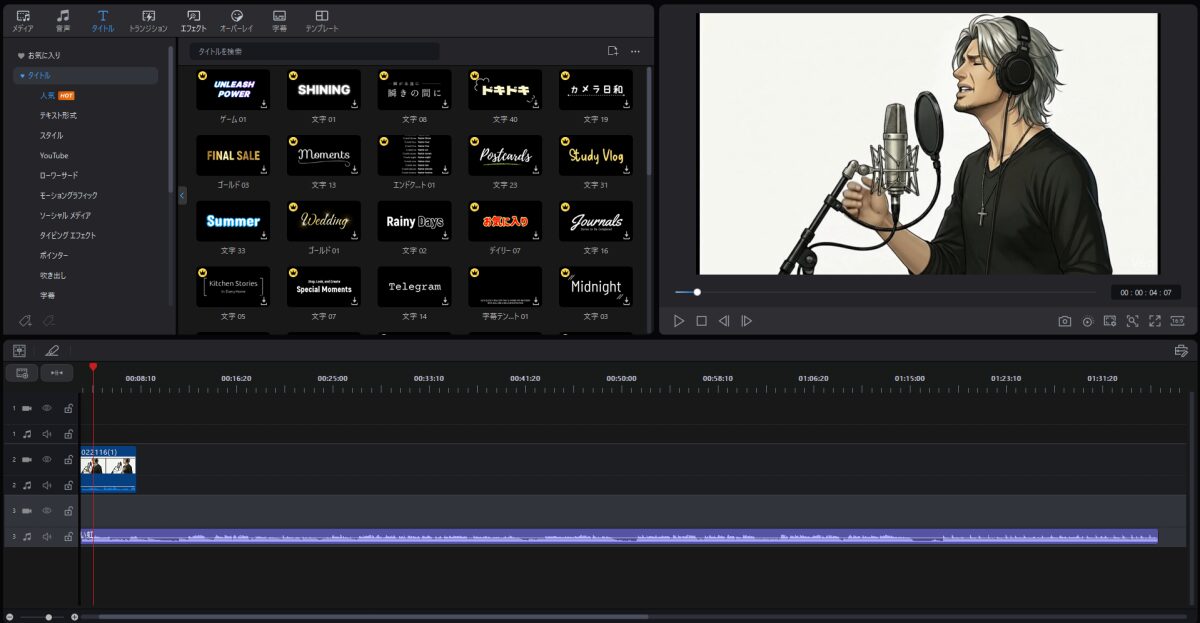 でも今私が望んでいるのは純粋な編集機能。そして動画作成の際に役立つタイトルやエフェクト、トランジションといった各装飾系素材の数や質なども重視しています。