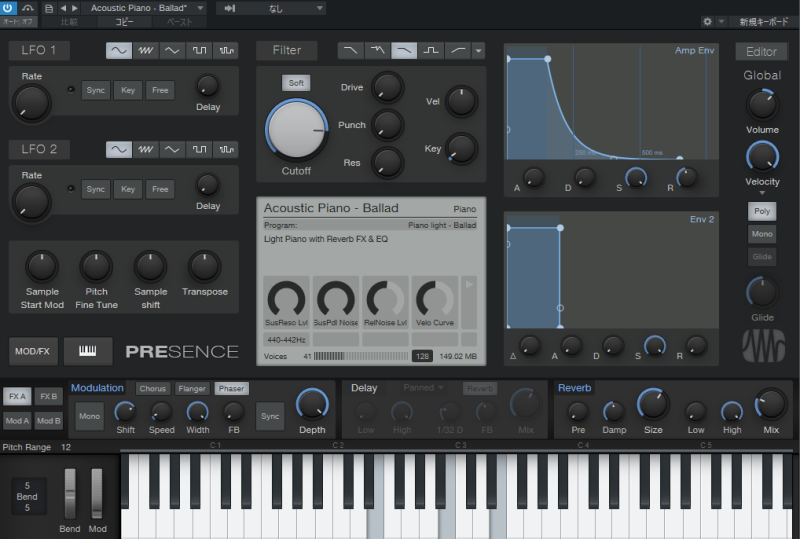 通常のピアノ以外にもエレピやシンセ系といった豊富なサウンドを使える為、鍵盤音源をまとめてゲットしたい方にはかなりオススメです。欠点は、無料サンプラーのWorkstationが使いにくい事かな。