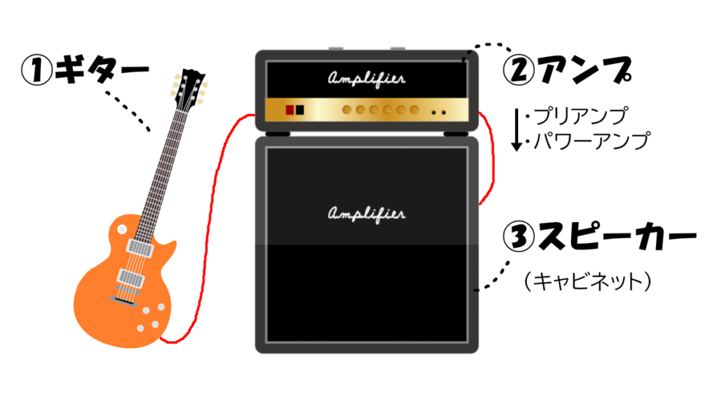 エレキギターの信号はシールドを通じアンプへ、アンプから接続されたスピーカーへと流れ音が出ます。アンプは主にプリアンプ部とパワーアンプ部があり、プリ→パワーの順に信号が通ります。